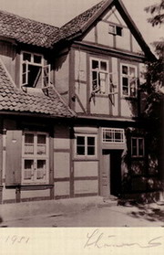 Altes Pfarrhaus bis 1969: Das Grundstück, auf welchem das Pfarrhaus steht, wurde im Jahre 1894 für 10 000 Mark vom Rentier August Rahlves erworben. Das alte Pfarrhaus wurde früher "Madamen Hof" genannt. Die Bezeichnung kommt daher, weil das Gebäude das ehemalige Altenteilerhaus des Gutes war. Dieser Alterssitz des Rittergutes wurde am 07.Januar 1761 bzw. 06.Juli 1761 an die Steinfeldten mitsamt dem Weberkamp veräußert. Das alte Pfarrhaus war ein einstöckiger Fachwerkbau mit geputzten und geissten bzw. geschlammten Backsteingefachen, auf der Westseite verbrettert. Über den Längsseiten befanden sich symmetrische Giebel. Innen befanden sich zum Teil noch die ursprünglichen Türen mit geschweiften Füllungen, in einem Zimmer war einfacher Deckenstuck vorhanden. Das alte Pfarrhaus wurde wegen Baufälligkeit und Unzulänglichkeit im Jahr 1969 abgerissen, nachdem 1967/68 ein neues Pfarrhaus an der Südseite des Grundstückes errichtet worden war. Ein Teil des ehemaligen Pfarrhausgeländes wurde zwischenzeitlich der Bundespost für die Errichtung einer Fernmeldezentrale verkauft. |