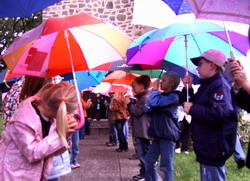 Nach dem Gottesdienst gingen die Einschulungskinder geordnet aus der Kirche und wurden von den älteren Mitschülern mit einem Spalier aus Regenschirmen empfangen